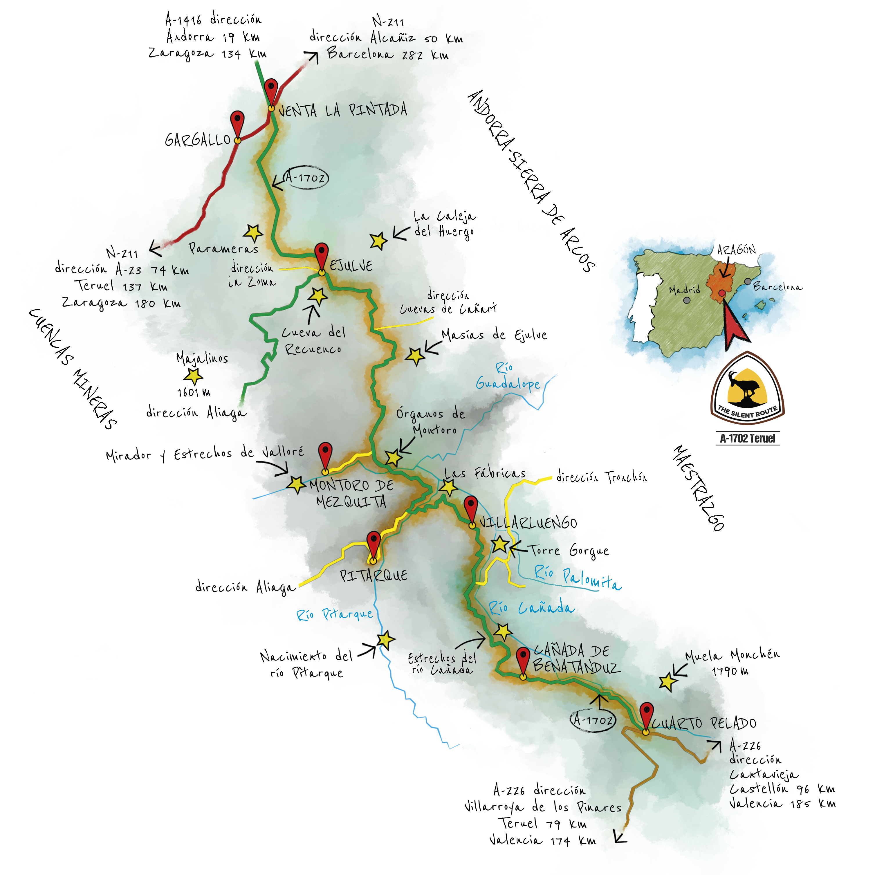 La carretera discurre como una vieja arruga por la piel de una tierra marcada por el silencio y el misterio que a primera vista parece un territorio áspero y agreste pero que pronto se muestra al visitante como un cautivador edén: masías solitarias, caminos angostos que abren senderos en la piedra, ríos frágiles y huérfanos, montañas que se elevan y tocan el cielo, vergeles que arropan los cursos de ríos y barranqueras, pueblos que se encaraman como un manto a las laderas o que se asoman vertiginosamente al precipicio, palacios, torreones, ermitas, telares, molinos…. Un paisaje de equilibrio entre naturaleza e historia en un entorno apenas transformado.